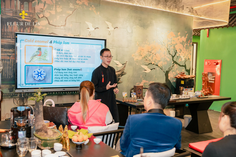 Tiếp nối chương trình, nghệ nhân Pháp Lam Trương Thanh Tùng – đồng thời là co-founder Fleur De Lis – đã giới thiệu về nguồn gốc, chất liệu và những kiến thức mới mẻ về nét đẹp văn hoá này. Từ phác thảo ban đầu, xử lý bề mặt kim loại, đến các công đoạn tô men, nung men, hoàn thiện, mỗi công đoạn đều phản ánh tinh thần thủ công truyền thống và sự đối thoại giữa bàn tay con người với chất liệu, đồng thời chuyển hóa nó thành một hình thức ứng dụng phù hợp với nhịp sống hiện đại.